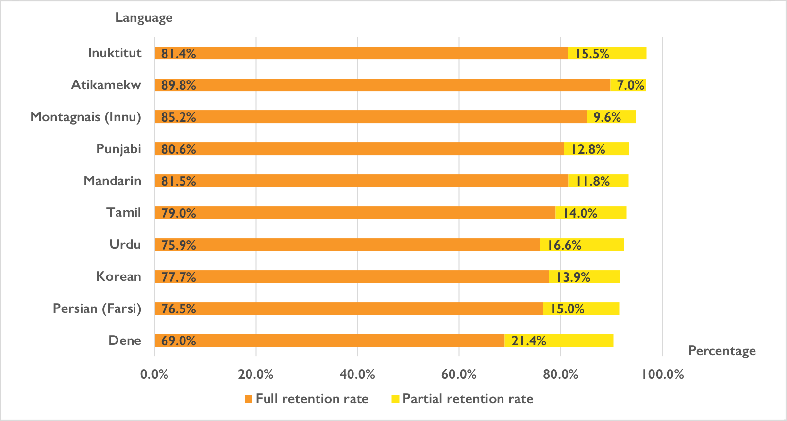 Bilingual and multilingual Canadians can face language retention challenges. The term “retention” describes how much a person continues speaking their mother tongue. Full retention means that the mother language is the language most spoken at home, whereas partial retention means that the mother language is spoken regularly, but not the most often. Different languages have different retention rates.